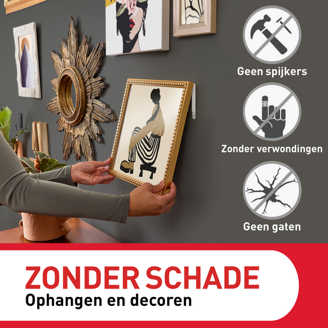 Houd lijsten vlak en veilig aan de wand; de onopvallende strips blijven verborgen achter de lijst.