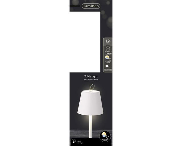 Lumineo Draadloze Oplaadbaar Tafel lampen voor BuitenEen serene lichtbron die warmte en Stijl samenbrengt in je tuin, balkon of terras. Deze oplaadbare Lumineo tafellamp in stralend wit is gemaakt van duurzaam Plastic en biedt drie sfeervolle lichtkleuren: warm wit, koel wit en classic warm. Dankzij de ingebouwde Batterij is deze lamp eenvoudig te verplaatsen zonder gedoe met snoeren, en met een brandduur van 8 uur geniet je langdurig van gezelligheid onder de sterren. Met zijn heldere, gelijkmatige SMD LED-licht zorgt deze lamp voor een ontspannen sfeer bij elk buitenmoment.Voordelen: