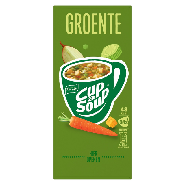 Een goed gevulde groentesoep met smaakvolle rode paprika, ui, wortel, erwt, knolselderij, prei en knapperige croutons. In een verpakking Cup-a-Soup Groente zitten 24 heerlijke zakjes Cup-a-Soup.