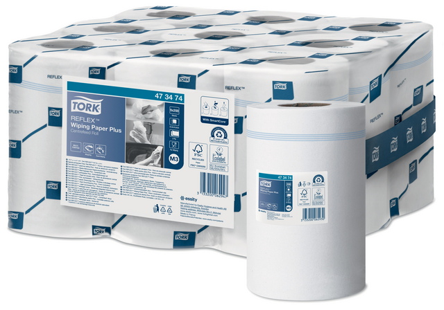 Het multifunctionele Tork Reflex™ Plus Centerfeed Poetspapier bestaat uit 2 lagen en is ideaal om vloeistoffen mee op te nemen of de handen te drogen. Het papier kan worden gebruikt in de Tork Mini Reflex™ Centerfeed Dispenser voor losse vellen, die bij de werkroutine van uw team past, het verbruik vermindert en het risico op kruisbesmetting minimaliseert