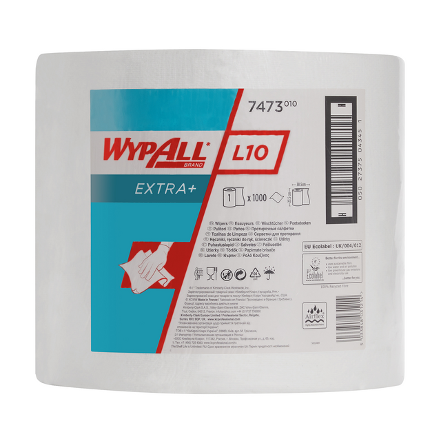 De WypAll L10 Extra+ reeks is ontworpen om klanten betrouwbare multifunctionele poetsdoeken te bieden voor poetstaken. De WypAll L10 Extra+ Poetsdoek Grote rol 7473 is de ideale oplossing voor middelzware poetstaken, het polijsten van glas en het reinigen van oppervlakken en gereedschap. De unieke Airflex basismateriaal technologie is sterk genoeg om elke taak van begin tot eind te volbrengen. De doek valt niet uit elkaar en absorbeert voldoende om de meeste morsplekken met gemak op te ruimen.