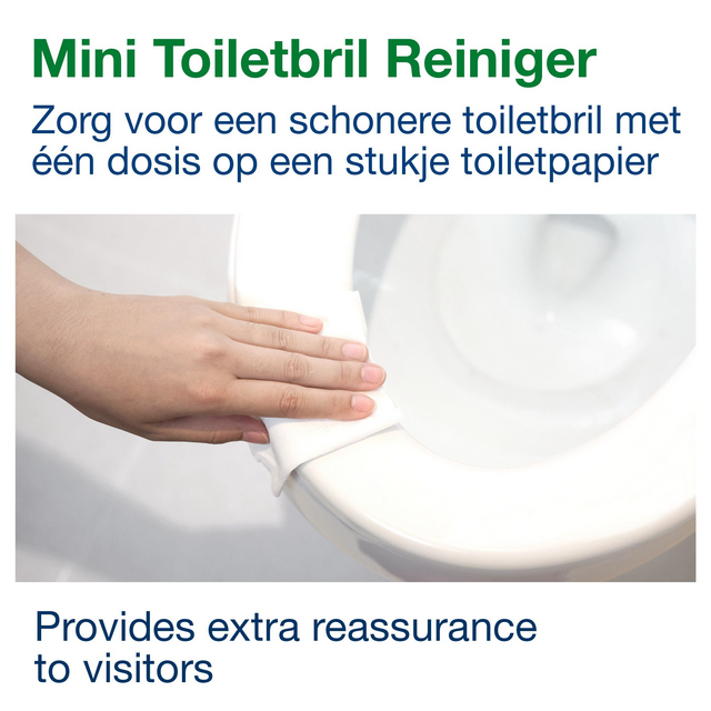 Tork Toiletbril Reiniger biedt extra zekerheid aan bezoekers. Eén dosis toiletbrilreiniger op een stuk toiletpapier zorgt voor een schonere toiletbril. Geschikt voor de Tork Mini Zeep en Handdesinfectie Dispensers die heel eenvoudig zijn in gebruik.