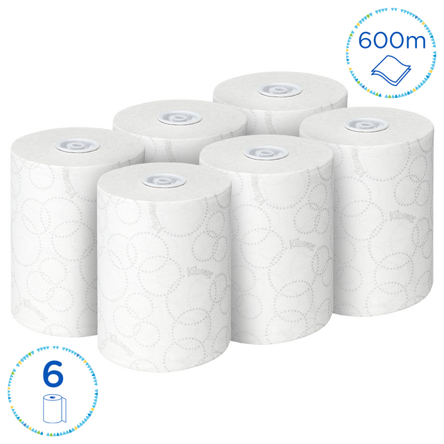 De efficiëntie blijft gehandhaafd bij gebruik van de witte papieren handdoeken op rol. Met de innovatieve vervangingsfunctie van de rol die nooit opraakt in de compatibele handdoekdispensers van Kimberly-Clark™ kunt u een vervangende rol in het systeem plaatsen voordat de oorspronkelijke rol is verbruikt. Dit zorgt voor een soepele overgang tussen rollen zodat afval tot een minimum wordt beperkt en uw gebruiker continu de hygiënestandaarden kan naleven.