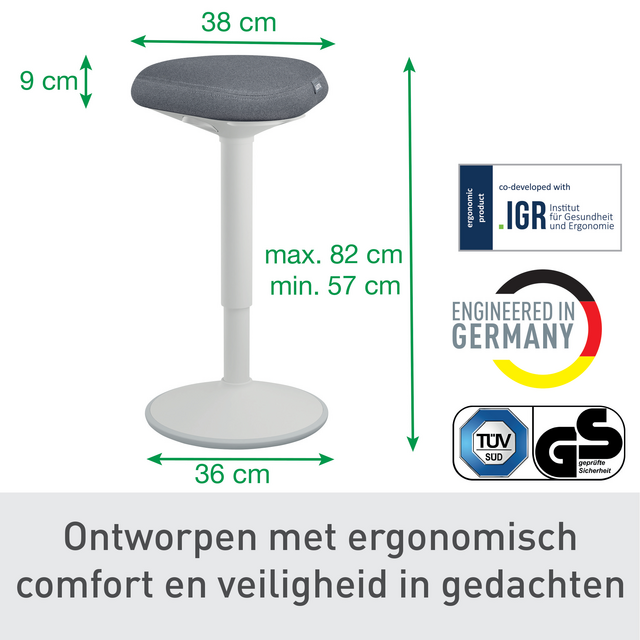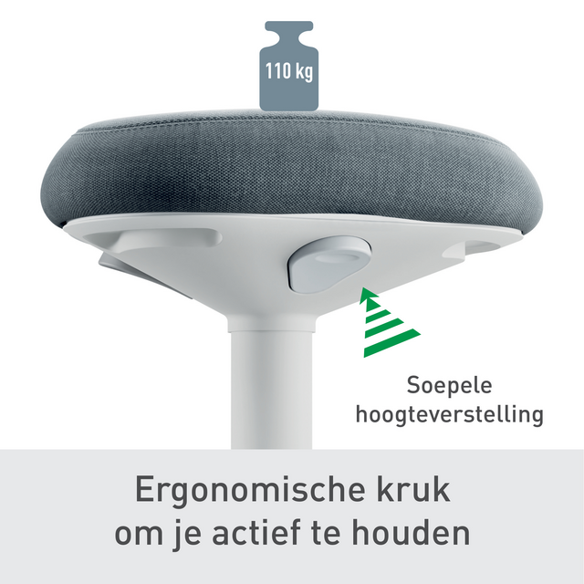 De Leitz Ergo wiebelkruk met gasveer heeft een unieke DDF-comfortzitting (Dual Density Foam) met een stevige ergonomische kern. De driehoekige vorm lijkt op een zadelkruk, verdeelt het gewicht gelijkmatig over het bekken en is omgeven door zacht schuim om de druk op de dijen en benen te verminderen. De 9cm dikke zitting is ontworpen voor comfort en kan worden gebruikt om te leunen of volledig te zitten. Dit stimuleert gebruikers om meer rechtop te zitten en biedt een ultracomfortabele zitervaring die lijkt op een zitkussen. De afgeronde schommelende basis van de wiebelkruk stimuleert actieve beweging door te draaien terwijl je werkt, wat je rug en core versterkt en pijn voorkomt. De bekleding van de zitting is gemaakt van 100% gerecycled materiaal. Deze moderne en minimalistische wiebelkruk is ideaal voor thuis of op kantoor om het comfort te verhogen en de productiviteit te maximaliseren.