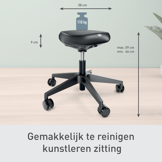 De Leitz Ergo Zitkruk helpt je om comfortabel en productief te blijven tijdens je werkdag! De driehoekige zitting vormt zich naar je lichaam als een zadel en helpt je gewicht gelijkmatig te verdelen voor meer comfort. De zitting is gemaakt van uniek 9cm dik Dual Density Foam (DDF). Dit betekent dat het schuim twee lagen heeft: een stevige binnenlaag voor sterke ondersteuning en een zachtere buitenlaag voor comfort. Deze combinatie helpt je om een goede houding te behouden en vermindert de druk op je benen, waardoor het gemakkelijker en aangenamer wordt om langere tijd zonder ongemak te zitten. Deze in hoogte verstelbare ergonomische kruk is getest en gecertificeerd door het Duitse Instituut voor Gezondheid en Ergonomie (IGR) en is gemaakt om te zorgen dat je comfortabel zit, of je nu thuis, op kantoor, in de salon, in de werkplaats of in het atelier werkt.