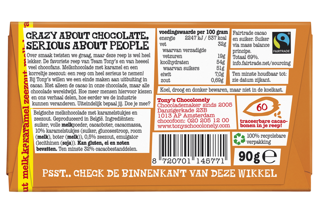 Over smaak twisten we graag, maar deze reep is wel heel lekker. De favorite reep van Team Tony's en van heeeel veel chocofans. Melkcholade met karamel een een korreltje zeezout: een reep om heel serieus te nemen. Nu in 'n kleiner reepje!Tony's chocolonely - samen maken we een einde aan uitbuiting in cacao! Bij tony's willen we een einde maken aan uitbuiting in cacao. Niet alleen de cacao in onze chocolade, maar alle chocolade wereldwijd. Hoe meer mensen hiervoor kiezen en ons verhaal delen, hoe eerder we de industrie kunnen veranderen. Uiteindelijk bepaal jij, doe je mee?