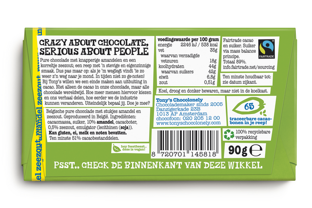 Pure chocolade met knapperige amandelen en een korreltje zeezout: een reep met 'n eigenzinnige smaak. Pas maar op: als je 'm weglegt vindt 'ie zo weer z'n weg naar je mond. In tijden niet zo ge-noten. Nu in 'n kleiner reepje!Tony's chocolonely - samen maken we een einde aan uitbuiting in cacao! Bij tony's willen we een einde maken aan uitbuiting in cacao. Niet alleen de cacao in onze chocolade, maar alle chocolade wereldwijd. Hoe meer mensen hiervoor kiezen en ons verhaal delen, hoe eerder we de industrie kunnen veranderen. Uiteindelijk bepaal jij, doe je mee?