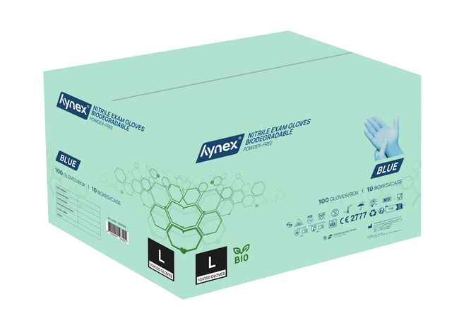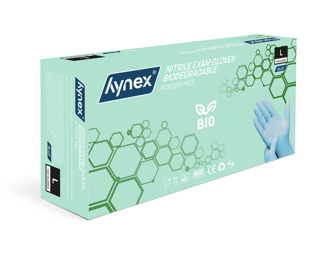 Duurzaam & comfortabel: biologisch afbreekbare nitril wegwerphandschoenen van Hynex Ontdek de nieuwste toevoeging aan het Hynex-assortiment: biologisch afbreekbare nitril wegwerphandschoenen. Met de introductie van deze biologisch afbreekbare handschoenen zetten we een logische stap in onze duurzame koers – zonder concessies te doen aan het ultieme draagcomfort en de optimale bescherming. En zoals je van Hynex gewend bent, geniet je nog steeds van de beste prijs-kwaliteitverhouding. Kies voor milieuvriendelijk gemak, zonder in te leveren op prestaties!Biologisch afbreekbare nitril wegwerphandschoenen De biologisch afbreekbare nitrilhandschoenen vormen een duurzaam alternatief. Dankzij de innovatieve toevoeging van bio-agentia in de formule behouden ze dezelfde betrouwbaarheid als gewone nitril wegwerphandschoenen. Dit betekent dat ze, zodra ze in contact komen met specifieke micro-organismen in de bodem, op natuurlijke wijze worden afgebroken zonder schadelijke resten achter te laten.Voor jouw gebruiksgemak Gemaakt van 100% biologisch afbreekbaar nitril, zijn deze handschoenen poedervrij en oppervlakte-gechloreerd voor extra comfort. Ze bieden een superieure sterkte, verbeterde lekbestendigheid en uitstekende chemische spatbescherming. Nitril heeft als eigenschap dat dit goed vormt naar de hand tijdens gebruik. Hierdoor heb je een goede grip, ook bij het werken in of met natte of geoliede producten of omgevingen. De getextureerde vingertoppen zorgen voor een betere grip bij zowel natte als droge omstandigheden, terwijl ze ook zorgen voor een optimale tastgevoeligheid waardoor ze een precieze aanraking mogelijk maken. Bovendien bieden deze handschoenen betrouwbare bescherming tegen bacteriën en schimmels. De gekrulde rand extra biedt extra gemak bij het aan- en uittrekken, zorgt ervoor dat vloeistoffen niet langs de arm lopen en voorkomt het terugdraaien van de handschoenen. Bovendien zijn ze zowel links als rechts te dragenSterk en betrouwbaar Nitril wegwerphandschoenen zijn sterker dan latex, rubber of vinyl handschoenen. Ze voorkomen besmettingsgevaar tijdens werkzaamheden waar hygiëne voorschriften belangrijk zijn. Werk je in de voedingsmiddelenindustrie, laboratoria, horeca of zorgsector? Dan zijn deze handschoenen de beste keuze! Nitril voor iedereen Verminder de kans op een latex allergie door puur en alleen nitril handschoenen te gebruiken. Tijdens het gebruik wordt huidirritatie voorkomen doordat de nitril handschoenen latex- en poedervrij zijn. Let op: niet steriel en geschikt voor eenmalig gebruik. Draag wegwerphandschoenen niet te lang, probeer ze elk 2 uur te vervangen voor een nieuw paar. Specificaties:?