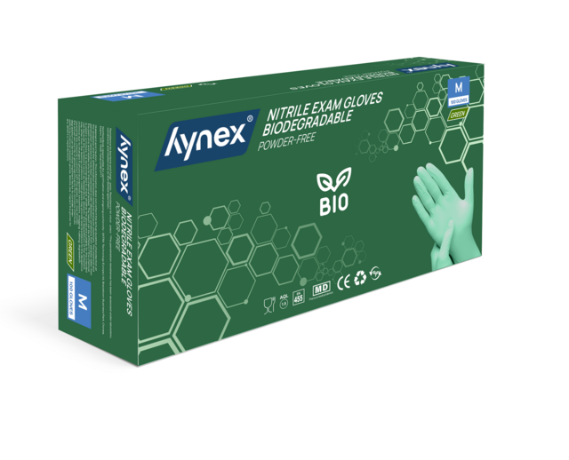 Duurzaam & comfortabel: biologisch afbreekbare nitril wegwerphandschoenen van Hynex Ontdek de nieuwste toevoeging aan het Hynex-assortiment: biologisch afbreekbare nitril wegwerphandschoenen. Met de introductie van deze biologisch afbreekbare handschoenen zetten we een logische stap in onze duurzame koers – zonder concessies te doen aan het ultieme draagcomfort en de optimale bescherming. En zoals je van Hynex gewend bent, geniet je nog steeds van de beste prijs-kwaliteitverhouding. Kies voor milieuvriendelijk gemak, zonder in te leveren op prestaties!Biologisch afbreekbare nitril wegwerphandschoenen De biologisch afbreekbare nitrilhandschoenen vormen een duurzaam alternatief. Dankzij de innovatieve toevoeging van bio-agentia in de formule behouden ze dezelfde betrouwbaarheid als gewone nitril wegwerphandschoenen. Dit betekent dat ze, zodra ze in contact komen met specifieke micro-organismen in de bodem, op natuurlijke wijze worden afgebroken zonder schadelijke resten achter te laten.Voor jouw gebruiksgemak Gemaakt van 100% biologisch afbreekbaar nitril, zijn deze handschoenen poedervrij en oppervlakte-gechloreerd voor extra comfort. Ze bieden een superieure sterkte, verbeterde lekbestendigheid en uitstekende chemische spatbescherming. Nitril heeft als eigenschap dat dit goed vormt naar de hand tijdens gebruik. Hierdoor heb je een goede grip, ook bij het werken in of met natte of geoliede producten of omgevingen. De getextureerde vingertoppen zorgen voor een betere grip bij zowel natte als droge omstandigheden, terwijl ze ook zorgen voor een optimale tastgevoeligheid waardoor ze een precieze aanraking mogelijk maken. Bovendien bieden deze handschoenen betrouwbare bescherming tegen bacteriën en schimmels. De gekrulde rand extra biedt extra gemak bij het aan- en uittrekken, zorgt ervoor dat vloeistoffen niet langs de arm lopen en voorkomt het terugdraaien van de handschoenen. Bovendien zijn ze zowel links als rechts te dragenSterk en betrouwbaar Nitril wegwerphandschoenen zijn sterker dan latex, rubber of vinyl handschoenen. Ze voorkomen besmettingsgevaar tijdens werkzaamheden waar hygiëne voorschriften belangrijk zijn. Werk je in de voedingsmiddelenindustrie, laboratoria, horeca of zorgsector? Dan zijn deze handschoenen de beste keuze! Nitril voor iedereen Verminder de kans op een latex allergie door puur en alleen nitril handschoenen te gebruiken. Tijdens het gebruik wordt huidirritatie voorkomen doordat de nitril handschoenen latex- en poedervrij zijn. Let op: niet steriel en geschikt voor eenmalig gebruik. Draag wegwerphandschoenen niet te lang, probeer ze elk 2 uur te vervangen voor een nieuw paar. Specificaties:?