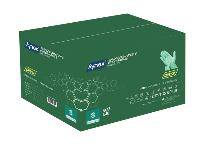 Duurzaam & comfortabel: biologisch afbreekbare nitril wegwerphandschoenen van Hynex Ontdek de nieuwste toevoeging aan het Hynex-assortiment: biologisch afbreekbare nitril wegwerphandschoenen. Met de introductie van deze biologisch afbreekbare handschoenen zetten we een logische stap in onze duurzame koers – zonder concessies te doen aan het ultieme draagcomfort en de optimale bescherming. En zoals je van Hynex gewend bent, geniet je nog steeds van de beste prijs-kwaliteitverhouding. Kies voor milieuvriendelijk gemak, zonder in te leveren op prestaties!Biologisch afbreekbare nitril wegwerphandschoenen De biologisch afbreekbare nitrilhandschoenen vormen een duurzaam alternatief. Dankzij de innovatieve toevoeging van bio-agentia in de formule behouden ze dezelfde betrouwbaarheid als gewone nitril wegwerphandschoenen. Dit betekent dat ze, zodra ze in contact komen met specifieke micro-organismen in de bodem, op natuurlijke wijze worden afgebroken zonder schadelijke resten achter te laten.Voor jouw gebruiksgemak Gemaakt van 100% biologisch afbreekbaar nitril, zijn deze handschoenen poedervrij en oppervlakte-gechloreerd voor extra comfort. Ze bieden een superieure sterkte, verbeterde lekbestendigheid en uitstekende chemische spatbescherming. Nitril heeft als eigenschap dat dit goed vormt naar de hand tijdens gebruik. Hierdoor heb je een goede grip, ook bij het werken in of met natte of geoliede producten of omgevingen. De getextureerde vingertoppen zorgen voor een betere grip bij zowel natte als droge omstandigheden, terwijl ze ook zorgen voor een optimale tastgevoeligheid waardoor ze een precieze aanraking mogelijk maken. Bovendien bieden deze handschoenen betrouwbare bescherming tegen bacteriën en schimmels. De gekrulde rand extra biedt extra gemak bij het aan- en uittrekken, zorgt ervoor dat vloeistoffen niet langs de arm lopen en voorkomt het terugdraaien van de handschoenen. Bovendien zijn ze zowel links als rechts te dragenSterk en betrouwbaar Nitril wegwerphandschoenen zijn sterker dan latex, rubber of vinyl handschoenen. Ze voorkomen besmettingsgevaar tijdens werkzaamheden waar hygiëne voorschriften belangrijk zijn. Werk je in de voedingsmiddelenindustrie, laboratoria, horeca of zorgsector? Dan zijn deze handschoenen de beste keuze! Nitril voor iedereen Verminder de kans op een latex allergie door puur en alleen nitril handschoenen te gebruiken. Tijdens het gebruik wordt huidirritatie voorkomen doordat de nitril handschoenen latex- en poedervrij zijn. Let op: niet steriel en geschikt voor eenmalig gebruik. Draag wegwerphandschoenen niet te lang, probeer ze elk 2 uur te vervangen voor een nieuw paar. Specificaties:?