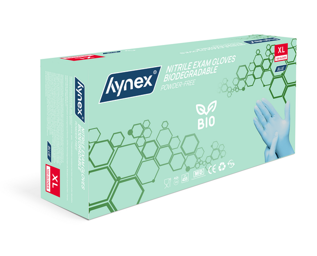 Duurzaam & comfortabel: biologisch afbreekbare nitril wegwerphandschoenen van Hynex Ontdek de nieuwste toevoeging aan het Hynex-assortiment: biologisch afbreekbare nitril wegwerphandschoenen. Met de introductie van deze biologisch afbreekbare handschoenen zetten we een logische stap in onze duurzame koers – zonder concessies te doen aan het ultieme draagcomfort en de optimale bescherming. En zoals je van Hynex gewend bent, geniet je nog steeds van de beste prijs-kwaliteitverhouding. Kies voor milieuvriendelijk gemak, zonder in te leveren op prestaties!Biologisch afbreekbare nitril wegwerphandschoenen De biologisch afbreekbare nitrilhandschoenen vormen een duurzaam alternatief. Dankzij de innovatieve toevoeging van bio-agentia in de formule behouden ze dezelfde betrouwbaarheid als gewone nitril wegwerphandschoenen. Dit betekent dat ze, zodra ze in contact komen met specifieke micro-organismen in de bodem, op natuurlijke wijze worden afgebroken zonder schadelijke resten achter te laten.Voor jouw gebruiksgemak Gemaakt van 100% biologisch afbreekbaar nitril, zijn deze handschoenen poedervrij en oppervlakte-gechloreerd voor extra comfort. Ze bieden een superieure sterkte, verbeterde lekbestendigheid en uitstekende chemische spatbescherming. Nitril heeft als eigenschap dat dit goed vormt naar de hand tijdens gebruik. Hierdoor heb je een goede grip, ook bij het werken in of met natte of geoliede producten of omgevingen. De getextureerde vingertoppen zorgen voor een betere grip bij zowel natte als droge omstandigheden, terwijl ze ook zorgen voor een optimale tastgevoeligheid waardoor ze een precieze aanraking mogelijk maken. Bovendien bieden deze handschoenen betrouwbare bescherming tegen bacteriën en schimmels. De gekrulde rand extra biedt extra gemak bij het aan- en uittrekken, zorgt ervoor dat vloeistoffen niet langs de arm lopen en voorkomt het terugdraaien van de handschoenen. Bovendien zijn ze zowel links als rechts te dragenSterk en betrouwbaar Nitril wegwerphandschoenen zijn sterker dan latex, rubber of vinyl handschoenen. Ze voorkomen besmettingsgevaar tijdens werkzaamheden waar hygiëne voorschriften belangrijk zijn. Werk je in de voedingsmiddelenindustrie, laboratoria, horeca of zorgsector? Dan zijn deze handschoenen de beste keuze! Nitril voor iedereen Verminder de kans op een latex allergie door puur en alleen nitril handschoenen te gebruiken. Tijdens het gebruik wordt huidirritatie voorkomen doordat de nitril handschoenen latex- en poedervrij zijn. Let op: niet steriel en geschikt voor eenmalig gebruik. Draag wegwerphandschoenen niet te lang, probeer ze elk 2 uur te vervangen voor een nieuw paar. Specificaties:?