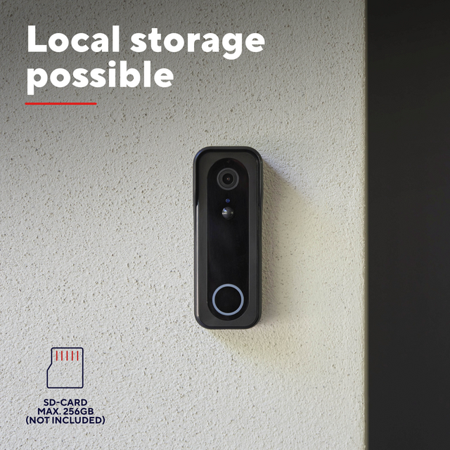 Deurbelcamera Trust DOORCAM-3000B zwartMet de Trust DOORCAM-3000B weet jij altijd wie er voor de deur staat, waar je ook bent. Deze slimme deurbelcamera geeft je direct contact met bezoekers via 2-weg audio, zodat jij eenvoudig kunt antwoorden, instructies kunt geven of iemand even kunt laten wachten. Dankzij de gratis Trust Smart Home Wifi app bekijk je livebeelden en opnames rechtstreeks op je smartphone, zonder extra hub of abonnement. Je kiest zelf hoe je installeert: volledig draadloos dankzij de ingebouwde batterij, eenvoudig oplaadbaar via USB-C, of permanent aangesloten via 8-24V voeding. De 3MP-camera levert helder beeld, terwijl infrarood nachtzicht en de wide angle lens zorgen voor extra veiligheid, zowel overdag als in het donker. Bewegingsdetectie kan automatisch opnames starten, die je lokaal opslaat op een microSD-kaart tot 256 GB. Zo houd jij controle over je beelden én je kosten. Met de meegeleverde draadloze gong hoor je de bel altijd, zelfs als je telefoon niet binnen handbereik is. Kies uit tientallen melodieën en stel het volume in zoals jij wilt. Let op: voor de gong zijn 3x AAA batterijen nodig. Zo haal je een complete, flexibele en gebruiksvriendelijke oplossing in huis voor meer gemak en veiligheid bij jouw voordeur.Kenmerken: