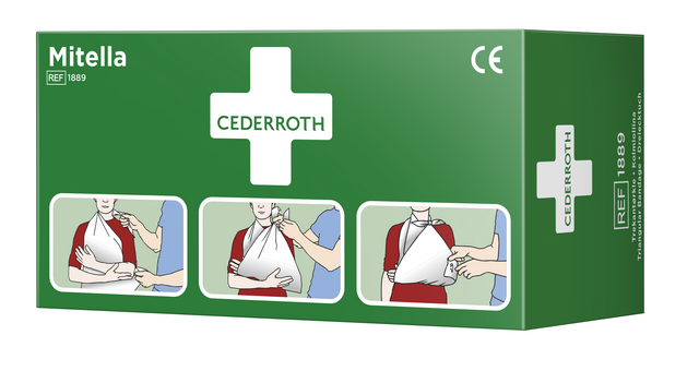Cederroth Mitella wordt om de nek gebonden voor ondersteuning van een verwonde arm. Kan ook om het hoofd worden gewikkeld om een kompres op zijn plaats te houden bij hoofdletsel. De mitella kan ook worden opgerold om als drukverband te gebruiken.