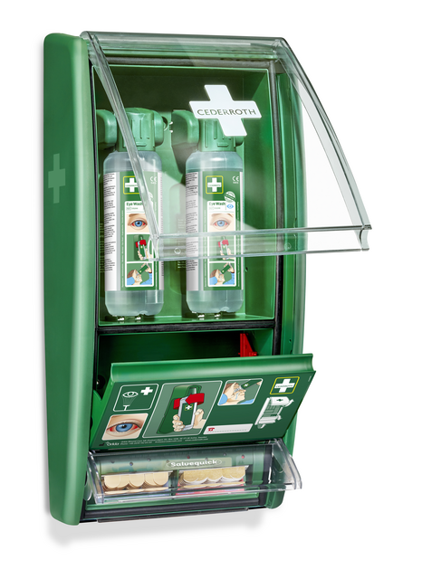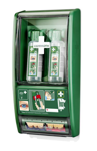 Inhoud:2 Cederroth oogdoucheflessen à 500 mlSalvequick pleisterautomaat incl. 40 textiel- en 45 plasticpleisters1 oogdouche-instructie1 sleutel
