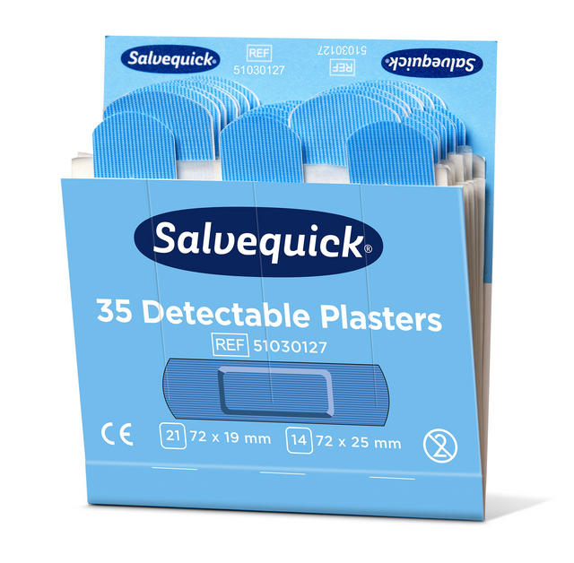 Salvequick Blue Detectable pleisters zijn in het bijzonder bedoeld voor gebruik in de levensmiddelenindustrie. De pleisters zijn detecteerbaar en worden door de meeste metaaldetectors ontdekt. Door de blauwe kleur kan de pleister ook gemakkelijk visueel worden ontdekt. De pleisters zijn op allergieën getest. Zij zijn gemakkelijk aan te brengen, flexibel en soepel te gebruiken.