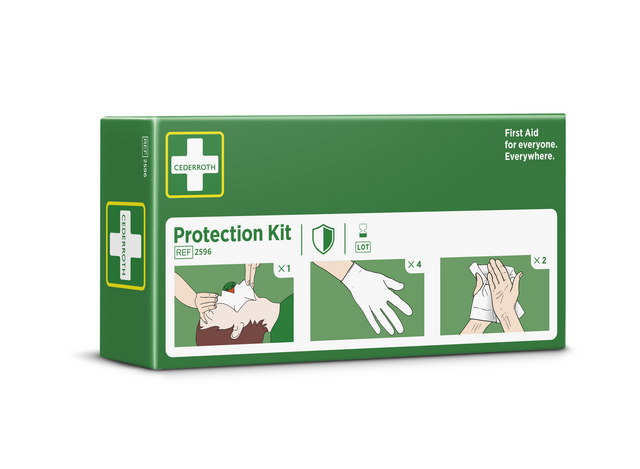 Inhoud:1 st. beademingsmasker met terugslagklep4 st. handschoenen2 st. Cederroth Safety Hand Cleanser (bevat 70% alcohol).