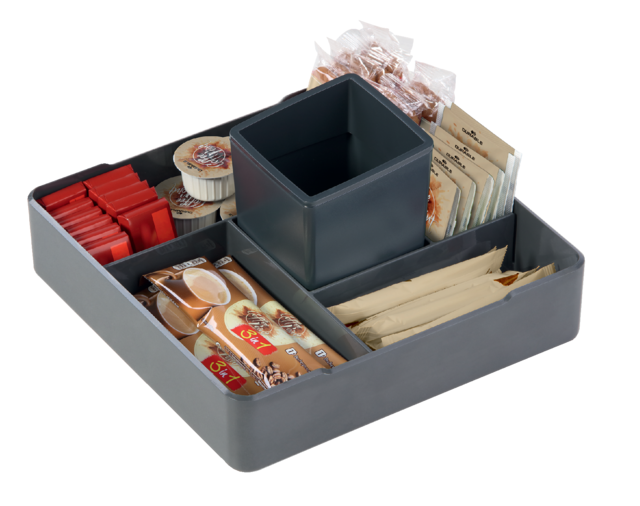 Ideaal om klein afval zoals lege melkcups, suikerzakjes, theezakjes en roerstokjes in weg te werpen.