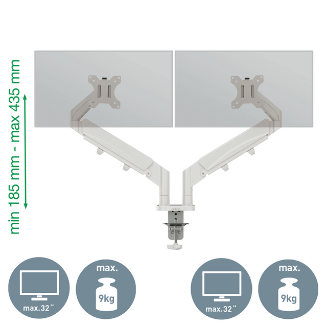 - Dubbele armen met veerondersteuning om de hoogte van de monitor gemakkelijk aan te passen (185mm-435mm).