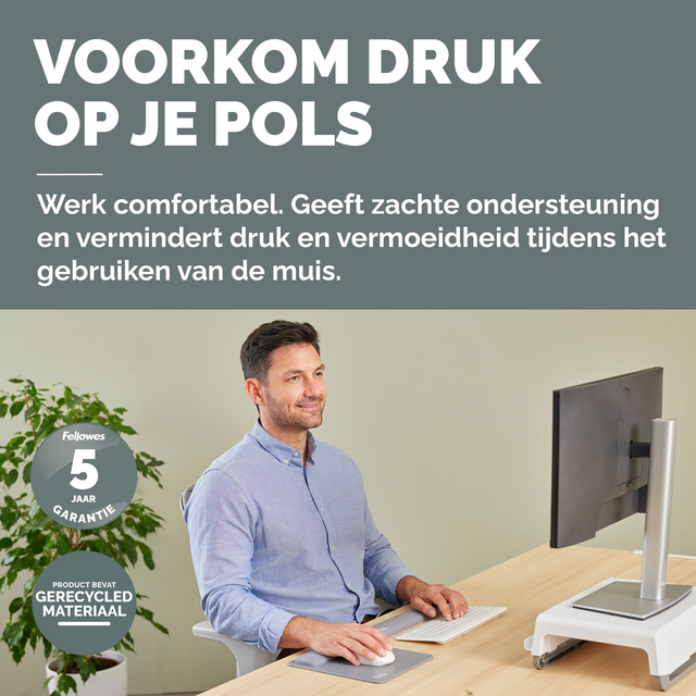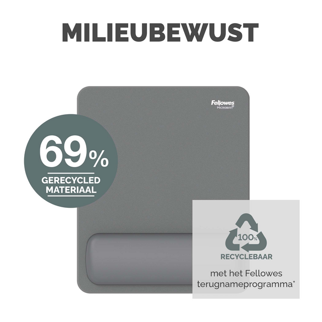 De HEX Cushion Technology™, waarvoor patent is aangevraagd, zorgt voor een gelijkmatige ondersteuning en supercomfort tijdens het muisgebruik. De zachte, stofwerende polssteun heeft een mooie afwerking en zorgt voor een soepele muiservaring. De ingebouwde Microban®-bescherming helpt de groei van bacteriën tegen te gaan en werkt 24/7 voor extra bescherming van het product. Bescherm je bureau en verbeter de prestaties van je muis met deze muismat die geschikt is voor optische en lasermuizen. Gemaakt van 69% gerecycled materiaal en 100% recyclebaar met het terugnameprogramma van Fellowes. Gemaakt om lang mee te gaan met 5 jaar beperkte garantie. Getest door FIRA International Ltd om te voldoen aan de ergonomische eisen van de Europese gezondheids- en veiligheidswetgeving: EN ISO 9241-5.