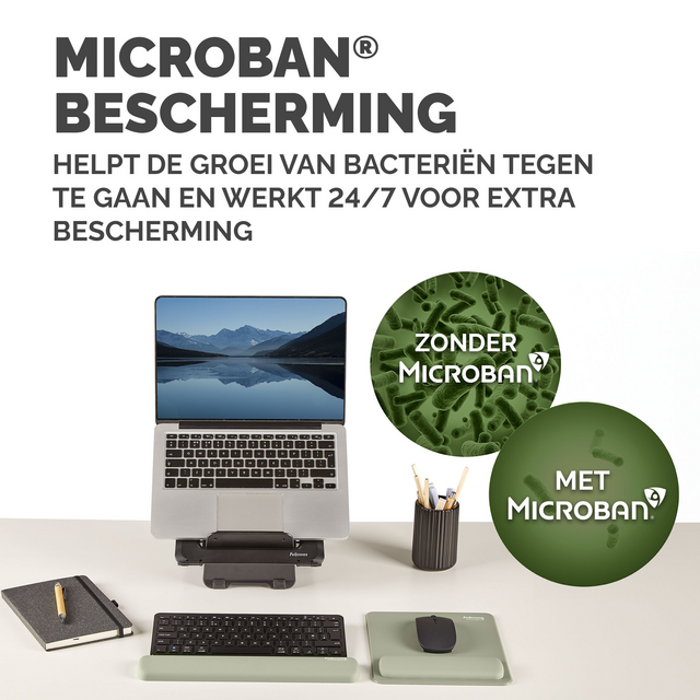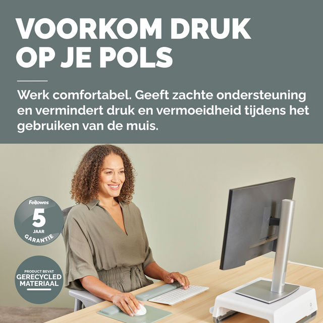 De HEX Cushion Technology™, waarvoor patent is aangevraagd, zorgt voor een gelijkmatige ondersteuning en supercomfort tijdens het muisgebruik. De zachte, stofwerende polssteun heeft een mooie afwerking en zorgt voor een soepele muiservaring. De ingebouwde Microban®-bescherming helpt de groei van bacteriën tegen te gaan en werkt 24/7 voor extra bescherming van het product. Bescherm je bureau en verbeter de prestaties van je muis met deze muismat die geschikt is voor optische en lasermuizen. Gemaakt van 69% gerecycled materiaal en 100% recyclebaar met het terugnameprogramma van Fellowes. Gemaakt om lang mee te gaan met 5 jaar beperkte garantie. Getest door FIRA International Ltd om te voldoen aan de ergonomische eisen van de Europese gezondheids- en veiligheidswetgeving: EN ISO 9241-5.