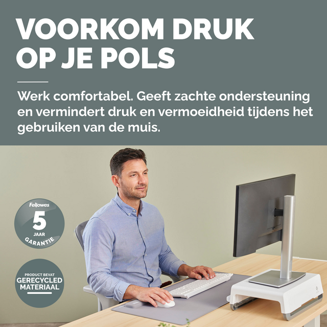 De HEX Cushion Technology™, waarvoor patent is aangevraagd, zorgt voor gelijkmatige ondersteuning en comfort tijdens het gebruiken van de muis. De zachte, stofwerende polssteun heeft een mooie afwerking en zorgt voor een soepele muiservaring. De ingebouwde Microban®-bescherming helpt de groei van bacteriën tegen te gaan en werkt 24/7 voor extra bescherming van het product. Draagbaar, lichtgewicht en compact ontwerp, ideaal voor hybride werken. 100% recyclebaar met het terugnameprogramma van Fellowes. Gemaakt om lang mee te gaan met 5 jaar beperkte garantie. Getest door FIRA International Ltd om te voldoen aan de ergonomische eisen van de Europese gezondheids- en veiligheidswetgeving: EN ISO 9241-5.