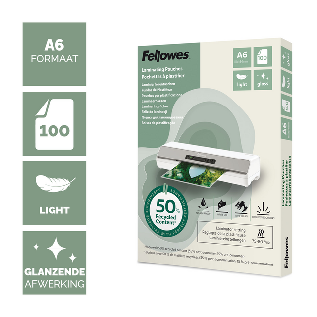Geef je documenten een nette, professionele uitstraling met deze A6 lamineerhoezen, ontworpen voor dagelijks gebruik en duurzame prestaties. Gemaakt van 50% gerecycled materiaal (minimaal 35% post-consumer, 15% pre-consumer) bieden ze betrouwbare bescherming en ondersteunen ze milieubewuste keuzes. De hoogwaardige glansafwerking zorgt voor veelzijdigheid en visuele aantrekkingskracht, ideaal voor een breed scala aan lamineertaken. Ontworpen voor gebruik op een instelling van 70/80 micron bevat elke hoes een antistatische toevoeging voor soepel en probleemloos gebruik. Verpakt in papiergebaseerde materialen uit duurzame bronnen, inclusief de hoesdrager, tape en buitenverpakking, is deze set van 100 hoezen een slimme keuze voor zowel thuis als op kantoor.