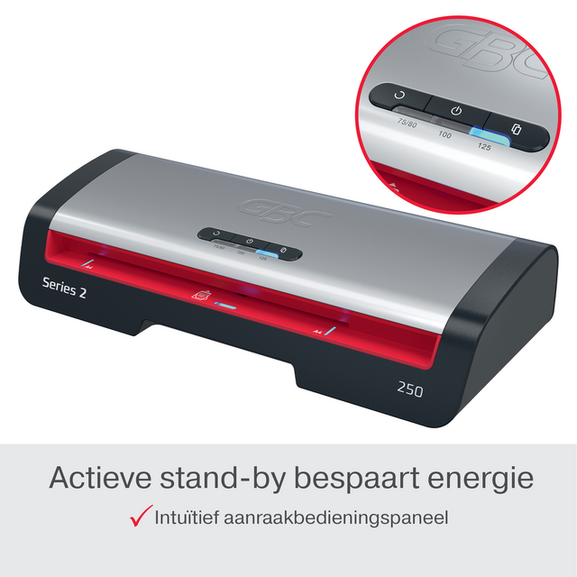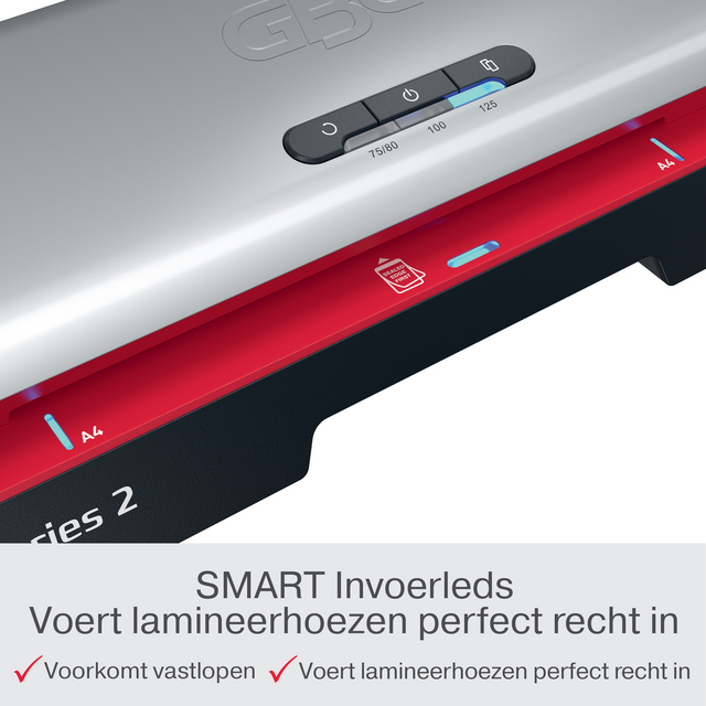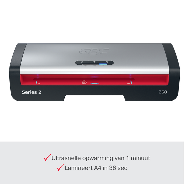 De GBC 250 A4 lamineermachine biedt een betrouwbare en efficiënte oplossing voor je alledaagse lamineerbehoeften. Deze lamineermachine is ontworpen voor professionele omgevingen en combineert prestaties met gebruiksgemak. Met een snelle opwarmtijd van 1 minuut lamineert hij een A4 vel van 75 micron in slechts 36 seconden, waardoor hij ideaal is voor snelle kantoortaken. Het intuïtieve bedieningspaneel biedt drie instellingen voor lamineerhoesdikte van 75 tot 125 micron, wat flexibiliteit biedt voor verschillende soorten documenten. Het paneel heeft ook een anti-vastloop omkeerknop voor probleemloze verwijdering van verkeerd geplaatste lamineerhoezen. Bovendien geeft het SMART status ledsysteem duidelijke visuele en auditieve signalen: rood tijdens het opwarmen, blauw met een geluid wanneer de machine klaar is en een automatische uitschakeling na 15 minuten inactiviteit voor energiebesparing. De SMART invoerleds zorgen voor een rechte uitlijning van de lamineerhoes om vastlopen te voorkomen, waardoor elke laminering perfect is. Bescherm en bewaar je belangrijke documenten met snelheid en telkens weer een gladde, professionele afwerking.