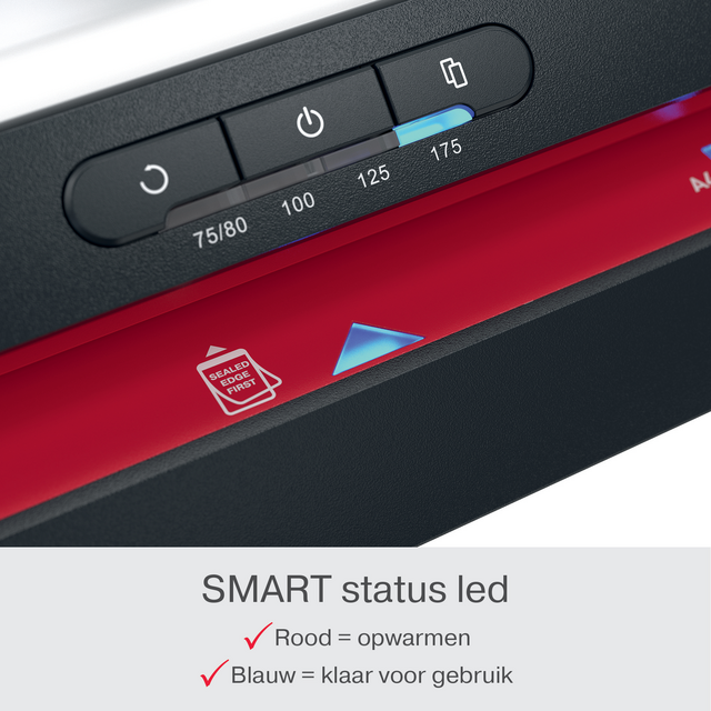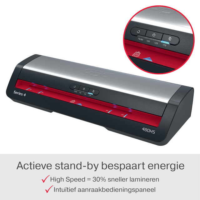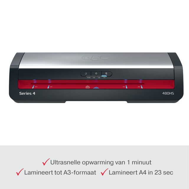 De GBC 480HS A3 lamineermachine biedt een betrouwbare en efficiënte oplossing voor het lamineren van grote volumes. Deze snelle lamineermachine is ontworpen voor professionele omgevingen en combineert prestaties met gebruiksgemak. Verhoog de productiviteit en verkort de lamineertijd met 33% met GBC HighSpeed lamineerhoezen. Met een snelle opwarmtijd van 1 minuut lamineert hij een A4 vel van 75 micron in slechts 23 seconden, waardoor hij ideaal is voor snelle kantoortaken. Het intuïtieve bedieningspaneel biedt vier instellingen voor lamineerhoesdikte van 75 tot 175 micron, wat flexibiliteit biedt voor verschillende soorten documenten. Het paneel heeft ook een handmatige omkeerknop en een automatische omkeerfunctie met actieve vastzetsensor voor naadloze verwijdering van een vastgelopen lamineerhoes. Bovendien geeft het SMART status ledsysteem duidelijke visuele en auditieve signalen: rood tijdens het opwarmen, blauw met een geluid wanneer de machine klaar is en een automatische uitschakeling na 15 minuten inactiviteit om energie te besparen. De SMART invoerleds zorgen voor een rechte uitlijning van de lamineerhoes om vastlopen te voorkomen, waardoor elke laminering perfect is. Bescherm en bewaar je belangrijke documenten met snelheid en telkens weer een gladde, professionele afwerking.