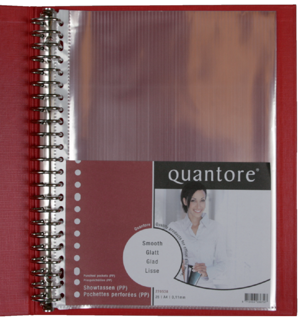 De Quantore showtas in A4-formaat is ideaal voor het duurzaam opbergen en presenteren van documenten. Vervaardigd uit stevig polypropyleen met een gladde structuur en een dikte van 0,11 mm, biedt deze showtas extra bescherming en een professionele uitstraling. De copysafe-eigenschap voorkomt dat afdrukken verkleuren of vastkleven, zelfs bij langdurig gebruik. De bovenzijde is open voor eenvoudig in- en uithalen van documenten en de 23 versterkte ponsgaten maken de showtas geschikt voor alle standaard mappen, ordners en ringbanden.Kenmerken: