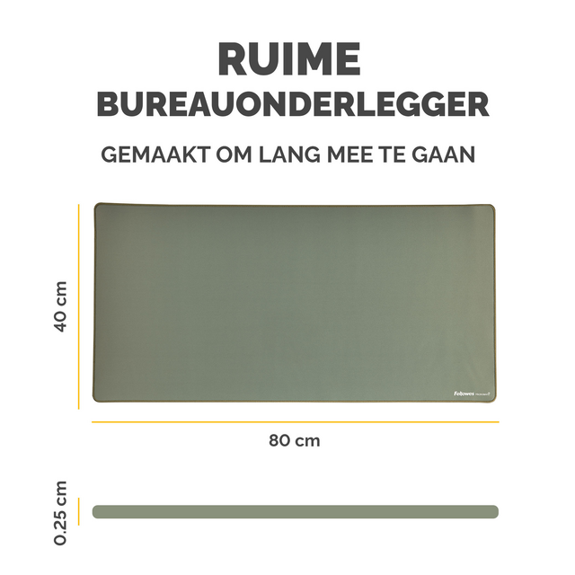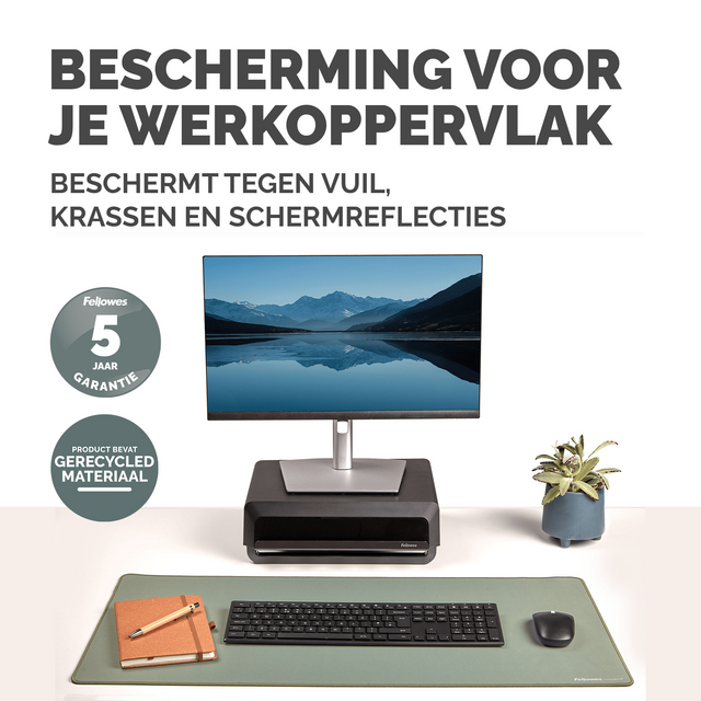 Ruime bureaumat beschermt tegen vuil en krassen en zorgt voor een niet-reflecterend werkoppervlak. Biedt een comfortabel oppervlak om te schrijven en te typen en verbetert de prestaties van de muis. Ingebouwde Microban®-bescherming helpt de groei van bacteriën te voorkomen en werkt 24/7 voor een extra niveau van productbescherming. Gemaakt van 83% gerecycled materiaal. Antislip onderkant houdt de mat de hele dag op zijn plaats. Duurzame platte stiksels voorkomen rafelen. Gemaakt om lang mee te gaan, met 5 jaar garantie.