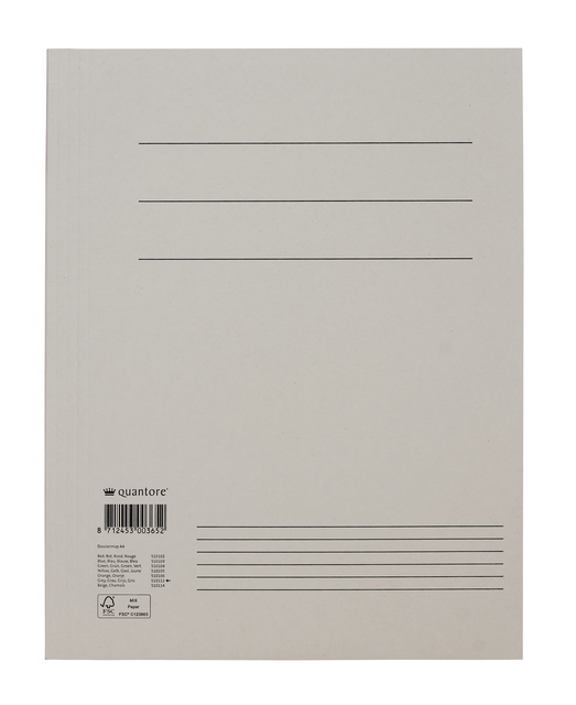 Door (leverproblemen) leveren we momenteel een alternatief zonder opdruk uit. Afbeelding wijkt af van de werkelijkheidKies voor duurzaamheid en kwaliteit met de dossiermap Quantore A4 300gr grijs. Deze stevige map is vervaardigd uit 300 grams gerecycled manillakarton en biedt optimale bescherming voor je documenten. Dankzij de drie stofkleppen blijven losse papieren netjes op hun plaats, ideaal voor gebruik in archieven, kantoren of thuis. De map voldoet aan de Blauwe Engel- en FSC-certificeringseisen, wat garant staat voor milieuvriendelijk materiaalgebruik. Met het A4-formaat van 238x310mm is de map perfect afgestemd op standaarddocumenten. Verpakt per 5x10 stuks in een omdoos – klaar voor intensief gebruik.Kenmerken: