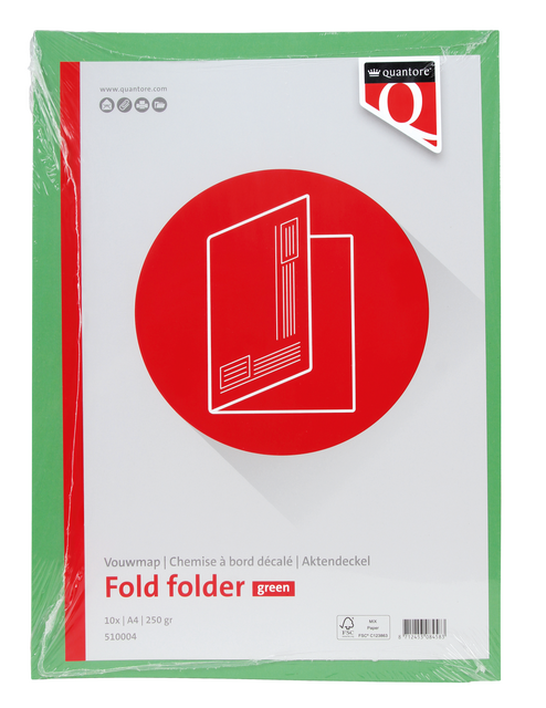 Door (leverproblemen) leveren we momenteel een alternatief zonder opdruk uit. Afbeelding wijkt af van de werkelijkheidHoud je documenten overzichtelijk en duurzaam opgeborgen met de vouwmap Quantore A4 ongelijke zijde 250gr groen. Deze stevige map is vervaardigd uit 250 grams manillakarton en is zowel FSC- als Blauwe Engel-gecertificeerd, wat betekent dat het karton 100% gerecycled én milieuvriendelijk is. Met het A4-formaat van 218/233x320mm is de map perfect geschikt voor het bewaren van standaard documenten. De ongelijke zijde zorgt voor extra gemak bij het openen en bladeren. Ideaal voor gebruik op kantoor, in archieven of thuis. Verpakt per 5 pakken van 10 stuks in een omdoos – klaar voor dagelijks gebruik.Kenmerken:
