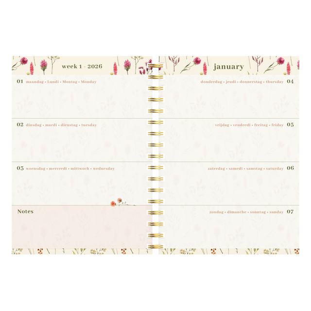 Met deze fleurige Flowers Bouquet wire-o agenda, hou je al je afspraken overzichtelijk bij de hand! Dankzij de wire-o ligt deze agenda mooi open en kan je makkelijk op beide pagina's schrijven. Binnenin vind je full coulour pagina's, met telkens 7 dagen op 2 pagina's, een jaar- en maandplanner en ruimte voor nota's. Het binnenwerk is in het Nederlands, Frans, Duits en Engels. De harde kaft heeft een matte finish en een glitter-gouden elastische sluiting om alles op zijn plek te houden.