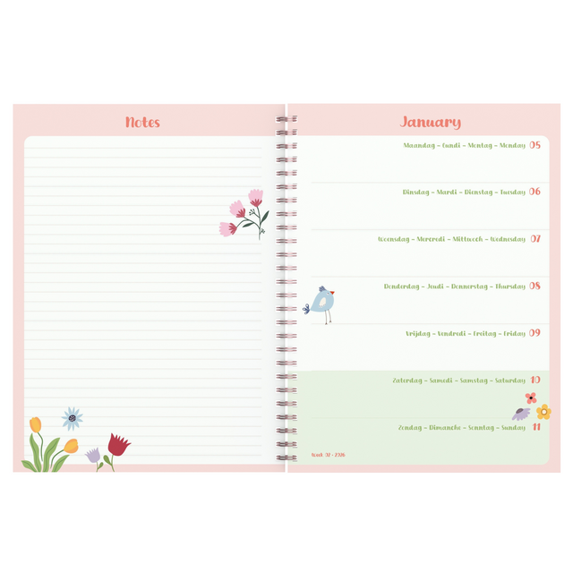 Met deze lieve Fragile wire-o bureau agenda, hou je al je afspraken overzichtelijk bij de hand, en heb je dankzij het grotere formaat plaats genoeg om alles te noteren! Dankzij de wire-o ligt deze agenda mooi open en kan je makkelijk op beide pagina's schrijven. Binnenin vind je full coulour pagina's, met telkens 7 dagen op 2 pagina's, een jaar- en maandplanner en ruimte voor nota's. Het binnenwerk is in het Nederlands, Frans, Duits en Engels. De flexibele kaft heeft een matte finish en een elastische sluiting om alles op zijn plek te houden.