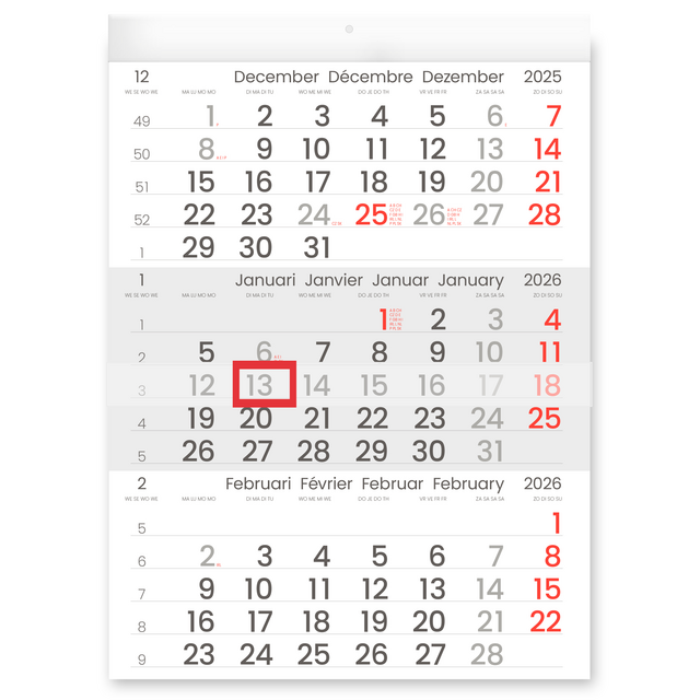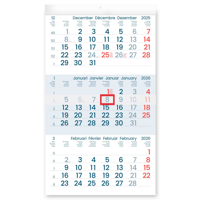 Groot Memento kalender met 6-maandoverzicht. Formaat.430x320 mm. 6 maanden per zijde metBelgische Feestdagen. Tweetalig en voorzien van schrijfruimte. Hard karton met een dikte van 1mm.