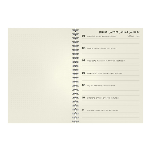 Deze A5 Daily Planner 2026 combineert functionaliteit met een bubblicious hip design. Met een overzichtelijke indeling van 7 dagen op 2 pagina’s en extra ruimte voor notities, biedt deze planner alles wat je nodig hebt om jouw planning efficiënt te beheren. De jaar- en maandplanners helpen je vooruit te kijken, terwijl de stickervel met maandtabs zorgt voor extra gebruiksgemak.Dankzij de stevige metal wire-o binding blijft de planner perfect openliggen, en de elastische sluiting houdt alles netjes bij elkaar. De luxe matte afwerking met spot UV-details en crèmekleurige pagina’s geven deze planner een elegante uitstraling.? Kenmerken:? Praktische indeling: 7 dagen per 2 pagina’s + ruimte voor notities? Overzichtelijke jaar- en maandplanners? Multitaal: beschikbaar in Nederlands, Frans, Duits en Engels? Duurzame wire-o binding voor een platliggende planner? Luxe afwerking: matte cover met spot UV-details? Extra handig: stickersheet met maandtabs