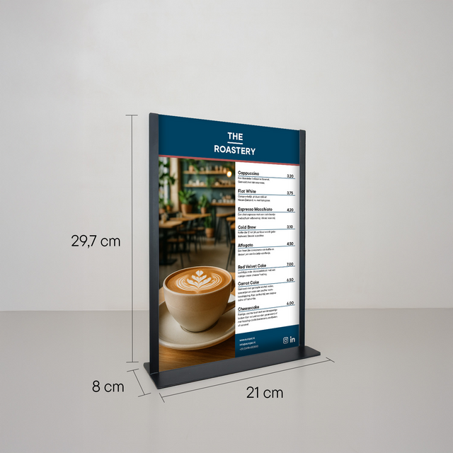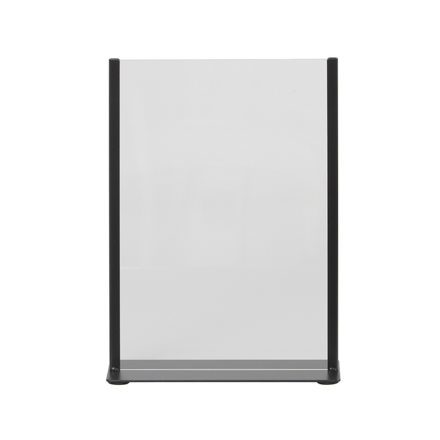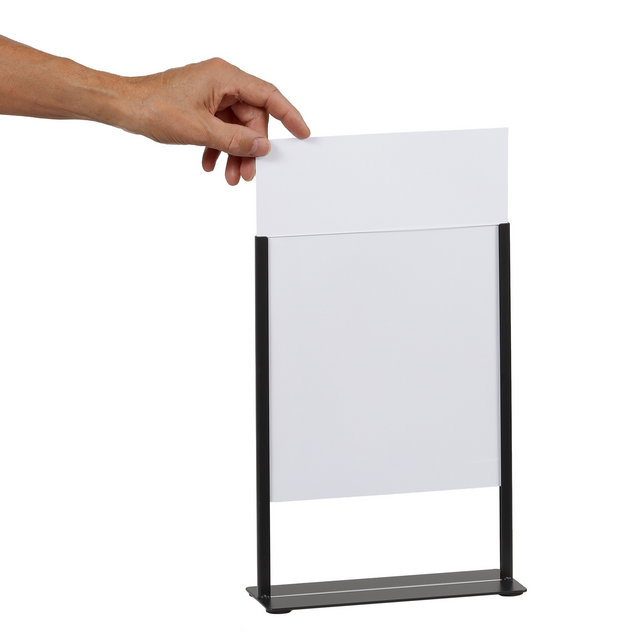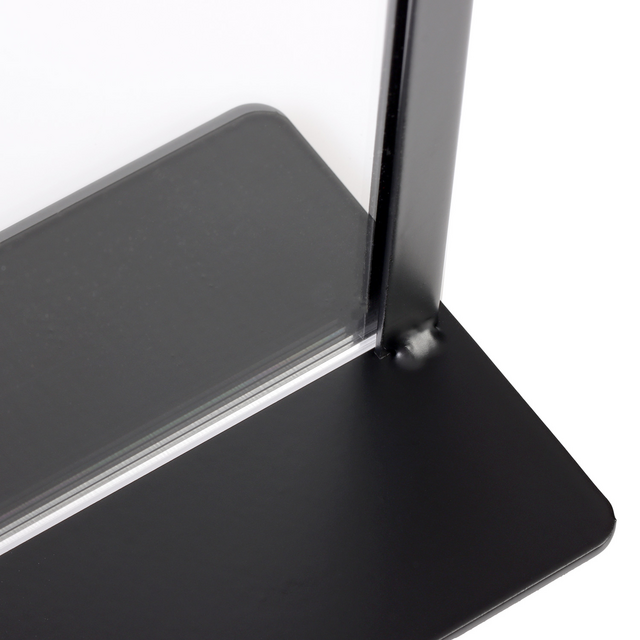 Wil je op een nette en opvallende manier je boodschap presenteren? Met de Europel kaarthouder in A4-formaat zit je helemaal goed. Deze zwarte metalen houder met een helder acryl display combineert een moderne look met stevig materiaal – ideaal voor drukke plekken zoals kantoren, hotels, restaurants, balies of vergaderruimtes. Dankzij het strakke design en het transparante display springt jouw boodschap meteen in het oog. Of je nu een mededeling, promotie, menukaart of veiligheidsinstructie toont, deze houder zorgt ervoor dat alles netjes en goed leesbaar gepresenteerd wordt. Het wisselen van documenten? Dat is in een paar tellen gepiept dankzij het handige insteeksysteem. En schoonmaken is ook zo gebeurd – wel zo fijn op plekken waar hygiëne belangrijk is.