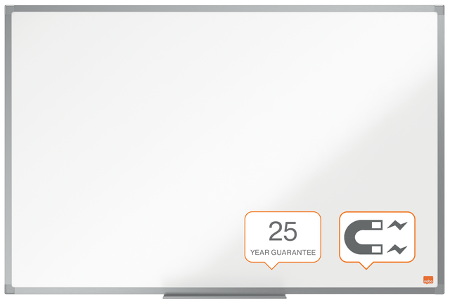 Magnetisch emaille whiteboard met een geanodiseerd aluminium frame. Bevestigd aan de wand door hoekmontage en voorzien van een pennengoot. Het magnetische emaille whiteboard oppervlak biedt een superieur niveau van uitwisbaarheid en duurzaamheid voor regelmatig gebruik.
