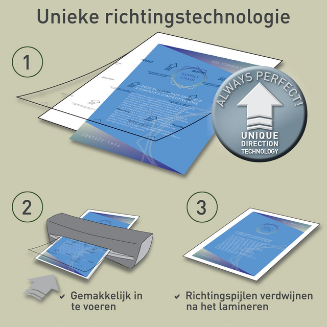 - Dankzij het ontwerp met UDT (Unique Direction Technology) zorgen pijlen op elke hoes ervoor dat ze correct worden ingevoerd voor een soepele, storingsvrije lamineerervaring.