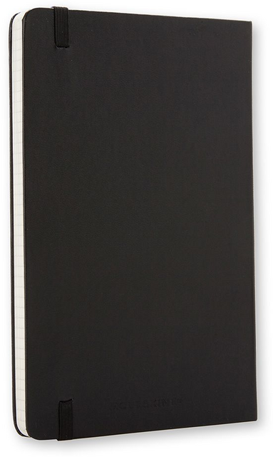 Kenmerken: afgeronde hoeken, elastische sluiting, ivoorkleurig Moleskine-papier, bijpassend leeslint, papier: 70 gsm, zuurvrij, “In geval van verlies”-label op het schutblad, uitbreidbaar binnenvak op achterkaft.