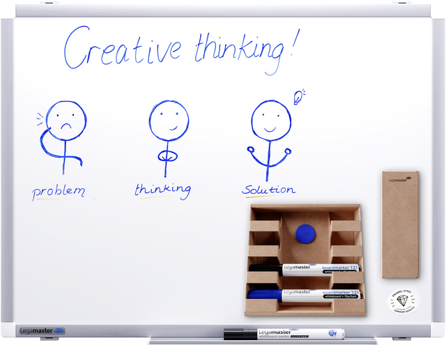 Ready to Play, meteen aan de slag met de meegeleverde zwarte en blauwe Legamaster whiteboard marker TZ1, kartonnen bordwisser, kartonnen markerhouder en magneet.