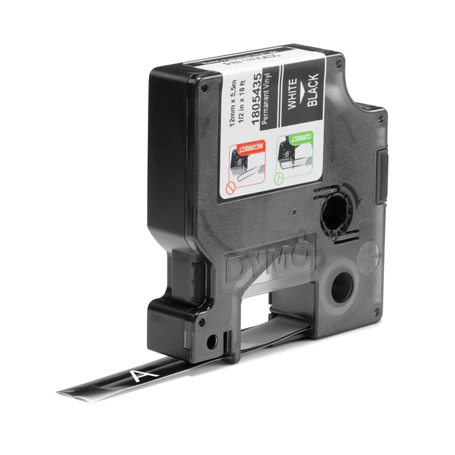Labeltape Dymo Rhino industrieel vinyl 12mm wit op zwart