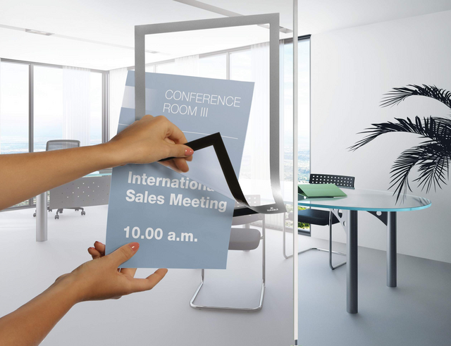 Duraframe is een zelfklevend kader, bestaande uit twee transparante folies die samen worden gehouden door de magnetische rand.