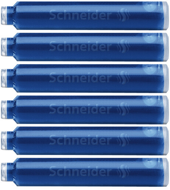 Standaard formaat inktpatronen met kogelsluiting. Passend in de vulpennen van Schneider, Pelikan en vele andere merken. De koningsblauwe inkt is uitwisbaar. Schneider is Emas gecertificeerd.