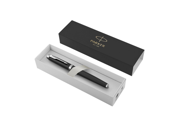 De verchroomde afwerkingen complementeren de resoluut moderne matzwarte gelakte body en maken deze Parker-pen tot het perfecte schrijfinstrument voor studenten en professionals.