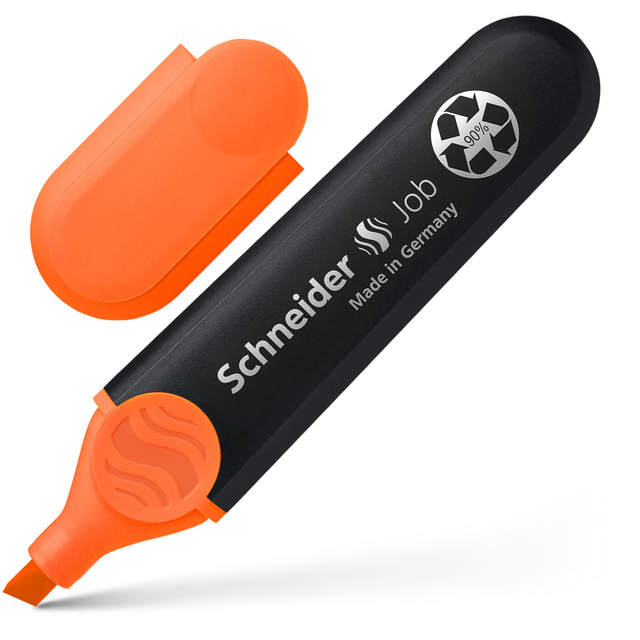 Markeerstift met twee lijndiktes in één punt, 1+5 mm. Markeringskleur: oranje. De markeerstift Job is de eerste markeerstift die voor meer dan 90% uit gerecycled materiaal bestaat en is bekroond met het wereldberoemde milieukeurmerk 'Blauer Engel'. De houder, het interne reservoir en de punt zijn gemaakt van gerecycled kunststof. De inkt is biologisch afbreekbaar. De universele inkt voor normaal, kopieer- en faxpapier heeft een maximale helderheid en is goed lichtbestendig. Daarom is de Job markeerstift aanbevolen voor gebruik op school, tijdens studies of op kantoor en is hij met zijn wigvormige punt ook perfect geschikt voor creatief werk in een bullet journal of voor kalligrafie bij handlettering. De markeerstift kan worden bijgevuld met het Maxx 660 navulstation. Met zijn grote inktvoorraad markeert de Job meer dan 15.000 woorden.