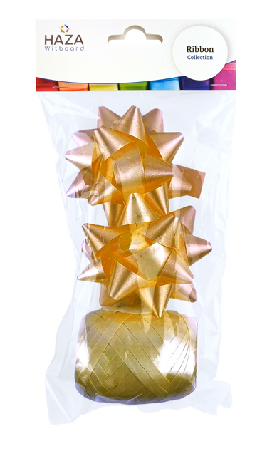 Setje van één polyband eitje, en twee rozetten. Afmeting eitje: 5mmx20m. Afmeting rozetten: 15mm lint, Ø75mm. Kleur: goud.