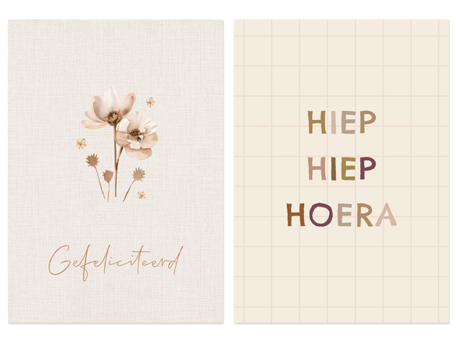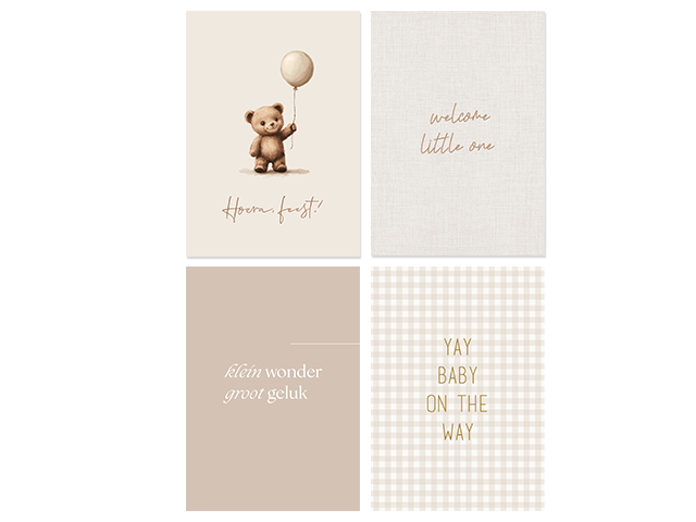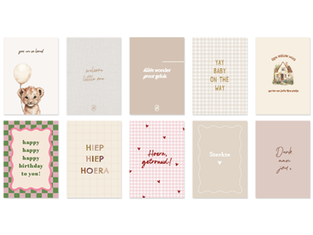 Een selectie 10 ansichtkaarten met uiteenlopende thema’s zoals geboorte, zwangerschap, nieuw huis, verjaardag, huwelijk en meeleven.