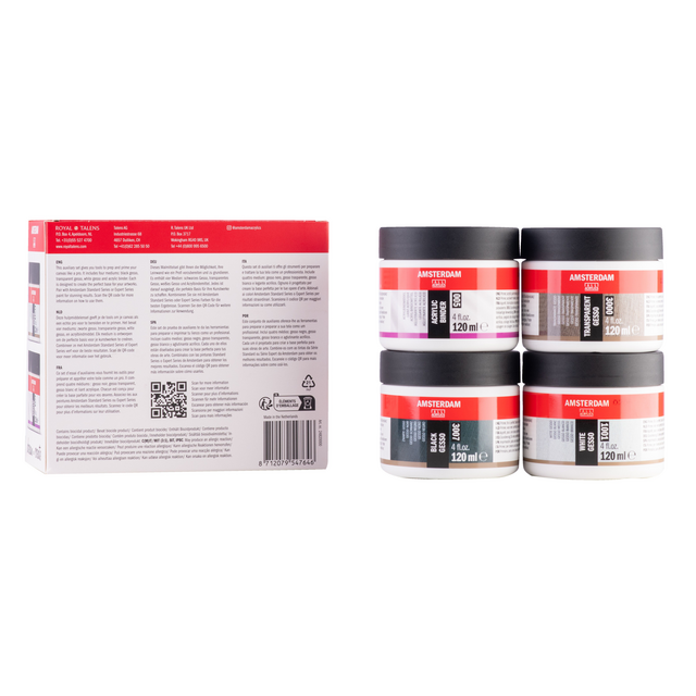 Met deze auxiliary proefset kun jij je canvas als een professional voorbereiden en primen. De set bevat vier mediums: zwarte gesso, transparante gesso, witte gesso en acrylbindmiddel. Elk medium is ontworpen om de perfecte basis voor je kunstwerken te creëren. Combineer met verf uit de Amsterdam Standard Series of Expert Series voor de beste resultaten. Deze set bevat: Acrylbindmiddel 120 ml: primer, voor het maken van acrylverf, collage lijmen. Multifunctioneel gebruik. Zwarte gesso 120 ml: primer, voor een perfecte basis op absorberende oppervlakken. Witte gesso 120 ml: primer, voor een perfecte basis op absorberende oppervlakken. Transparante gesso 120 ml: primer, voor een perfecte basis op absorberende oppervlakken.