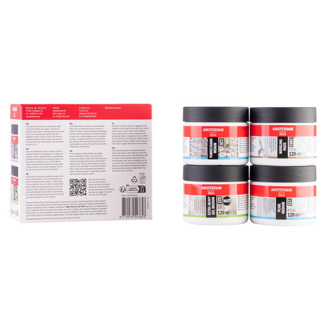 Deze auxiliary proefset is perfect voor het toevoegen van textuur, diepte en dynamisch reliëf aan je kunstwerken. De set bevat vier mediums: parelmedium, modelleerpasta, grof puimsteenmedium en extra heavy gel medium mat. Elk medium is ontworpen om een uniek 3D-effect te creëren. Combineer ze met verf uit de Amsterdam Standard Series of Expert Series voor het beste resultaat.Deze set bevat: Modelleerpasta 120 ml: te gebruiken voor het maken van reliëfgrond voor acrylverf. Extra heavy gel medium mat 120 ml: geschikt voor het vergroten van textuur en transparantie (mat). Puimsteen medium grof 120 ml: geschikt voor het maken van korrelige textuur en structuur. Parelmedium 120 ml: voor het verkrijgen van een glazen parelstructuur.